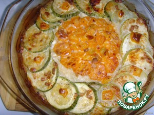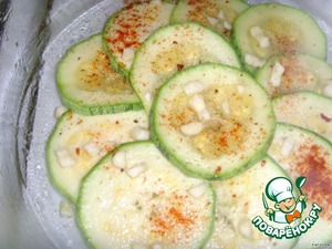 В форму для запекания выкладывать слоями(каждый слой слегка посолить, поперчить):половина кабачков(посыпать чесноком)-