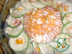 Сверху красиво выложить кружки кабачков, а в центре положить морковь.