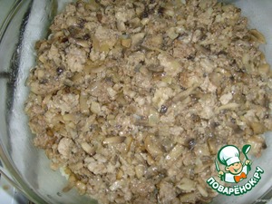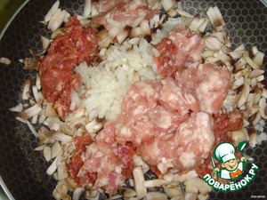 Рис сварить до полуготовности. Откинуть на дуршлаг. Морковь сварить в кожуре, почистить нарезать тонкими кружочками. Лук, чеснок, грибы мелко нарезать. Обжарить лук, грибы и фарш на растительном масле.