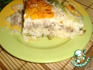 В форму для запекания выкладывать слоями(каждый слой слегка посолить, поперчить):половина кабачков(посыпать чесноком)-рис-грибы с фаршем и луком. Сверху красиво выложить кружки кабачков, а в центре положить морковь. Взбить яйца с майонезом и 3 -мя ст. л. воды, залить этой смесью запеканку.