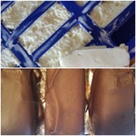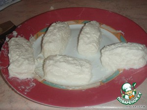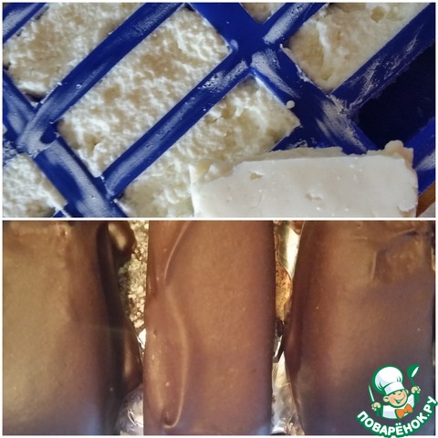 3. Растопить шоколад со сливками в микро в большой емкости. Достаем сырки из морозилки, кладем в шоколад, обваливаем его со всех сторон и с помощью 2 вилок достаем. Кладем на пергаментную бумагу. Ставим в холод.