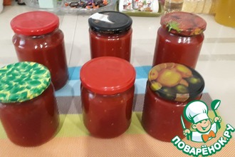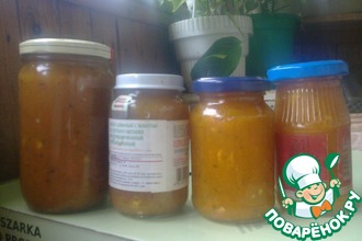 Вот такое количество соуса у меня получилось. Четыре баночки, и пол-литровая бутылка.