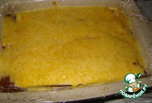 Противень застилаем пекарской бумагой, слегка смазанной сливочным маслом. Выливаем 2/3 теста и отправляем в разогретую до 200 г духовку на 8-10 минут.