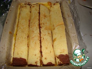 В форму, застеленную пищевой пленкой, выкладываем бисквит, который мы смазали джемом и оставили в стороне (Форма должна быть с высокими краями). На него выкладываем части рулета.