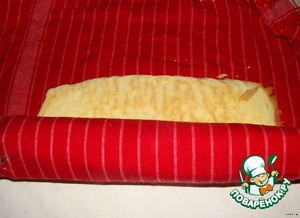 Готовый корж выкладываем на смоченную водой салфетку и заворачиваем вместе с салфеткой в рулет. Бисквит должен остыть. -