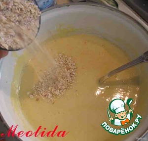 Снимаем с водяной бани маргариново-яичную смесь, добавляем овсяные хлопья..