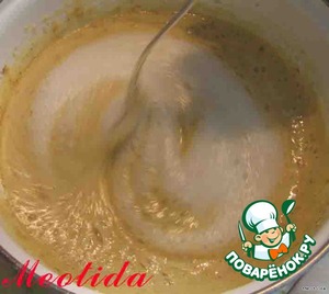 Добавляем желтки (от двух яиц), соду и, постоянно помешивая, готовим, пока смесь не побелеет и не увеличится в 2-3 раза в объеме