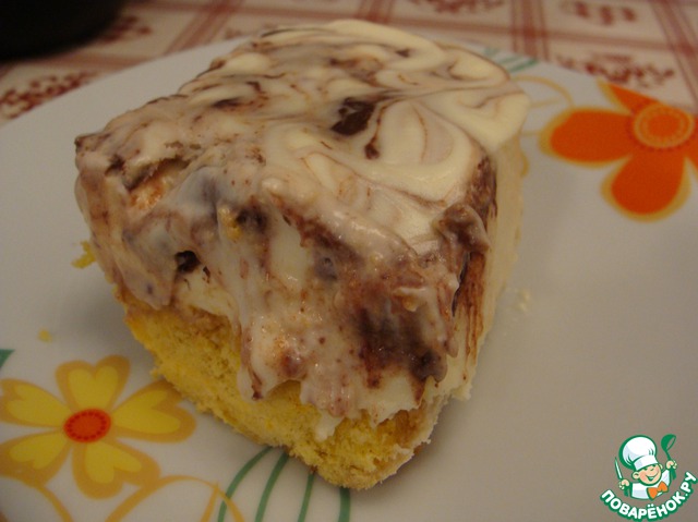 Далее хаотично вылить шоколадный соус и длинной палочкой придать нужный рисунок (можно самой растопить шоколад или использовать покупной шоколадный соус).