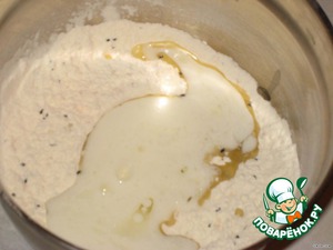 В миску просеять муку, смешать с сахаром, солью и кунжутом. Добавки могут быть разные, например мак, или немного раздробить семечки подсолнуха или тыквенные, просто орешки, с фисташками очень вкусно, можно взять тмин или укроп, также можно использовать мелко порезанный и обжаренный репчатый лук, как фантазия подскажет.