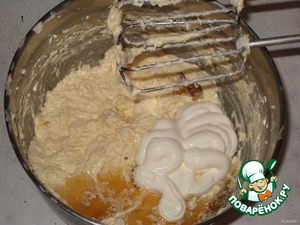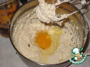 Затем по одному вбить яйца, хорошо взбивая после каждого, масса станет эластичнее и немного загустеет.