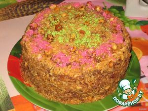 Верх и бока обмазываем кремом и посыпаем толчеными орехами или крошками от печенья (от коржей).
