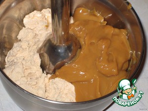 Вылить медовую смесь в творожную, перемешать, затем всыпать остальную муку и перемешать.