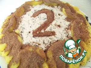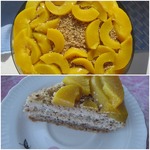 Теперь украшаем по усмотрению. У меня по краям выложены персики, сверху присыпаны молотым шоколадом,