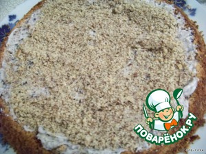 Намазываем первый корж кремом, высыпаем остаток молотых орехов. -