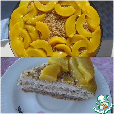 Коржи пропитываем сиропом от персиков, лучше с обеих сторон.