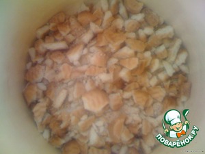 Поломать печенье на маленькие кусочки и смешать с маслом и 2 ст.л. сахара