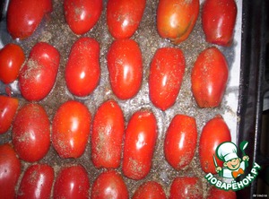 Томаты лучше брать сливовидной формы,они менее мясистые.Томаты помыть,разрезать на половинки,и выложить срезом вниз на пергамент смазанный растительным маслом.У меня была морская соль с чесноком,базиликом,орегано и тимьяном.Этой благоухающей солью я обильно посыпала томаты.Сразу хочу предупредить,что томаты нельзя сушить на фольге!