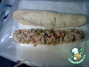 Теперь выкладываем нижнюю половинку багета на фольгу (у меня закончилась, пришлось использовать бумагу для выпекания). Фаршируем начинкой, достаточно сильно утрамбовывая (у меня все равно начинка вся не влезла). Поливаем оставшимся бульоном.