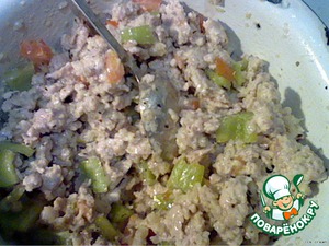 Все тщательно перемешиваем, добавляем 4-5 столовых ложек бульона. Солим, перчим, добавляем мускатный орех. В оригинальном рецепте начинка приправлялась лимонным соком и я решилась на эксперимент - добавила к своей начинке немного молотой апельсиновой цедры (в готовом блюде не ощущается, но и не портит)