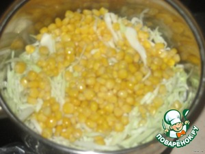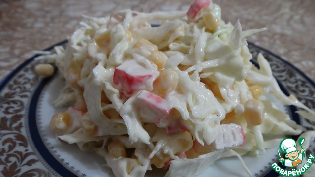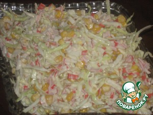 Смешать капусту, кукурузу, крабовые палочки, майонез, посолить и добавить чуть чуть молотого черного перца.