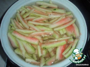 Для приготовления цукатов нам нужно взять светло-зеленую часть арбуза и очистить ее от зеленой кожицы и мякоти. У меня это не совсем хорошо получилось,т.к арбузы были тонкошкурые. Берем наши корочки и нарезаем кубиками или полосками(значения не имеет). Порезанные корочки положить в кипящую воду и проварить в ней до размягчения(это заняло у меня минут 10). Главное - не переварите.