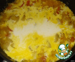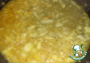 Заливаем бульоном, закрываем крышкой и тушим на среднем огне 5 минут -