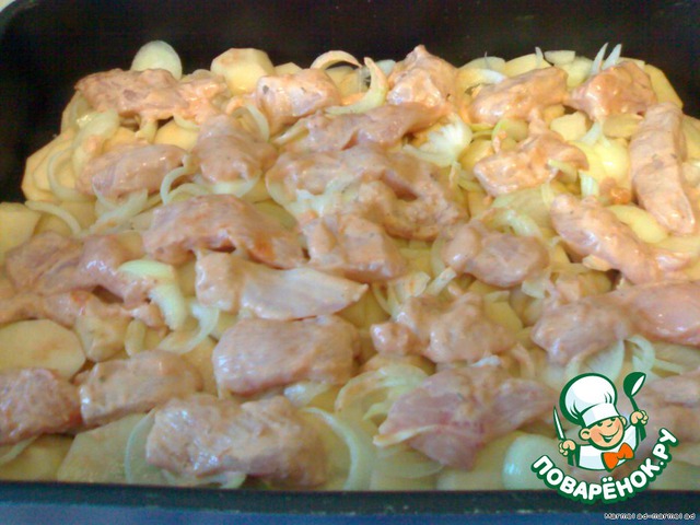 Лук нарезаем кольцами. Выкладываем поверх картофеля.
