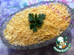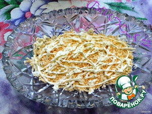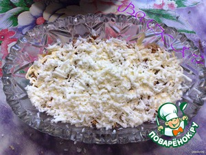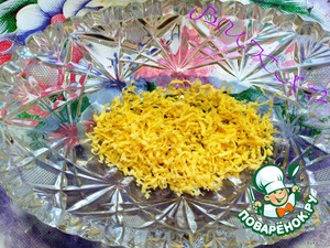 На мелкой терке 1,5 белка, 2 желтка, майонез