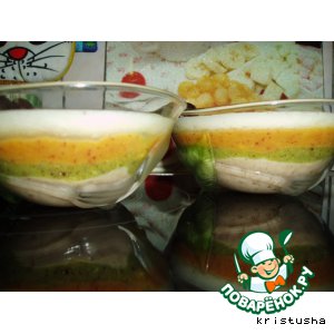 Взбиваем в блендере сначала банан - выливаем в формочки; затем киви - выливаем; персик-выливаем и наконец дыню, выливаем. После каждого взбитого фрукта мыть блендер, чтобы цвета не смешивались.