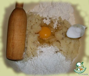 Приготовить картофельное пюре,дать остыть, перетереть его через сито, чтобы избавиться от нежелательных комочков. Вбить в пюре сырые куриные яйца, добавить муку, крахмал, соль по вкусу и замесить достаточно крутое тесто..