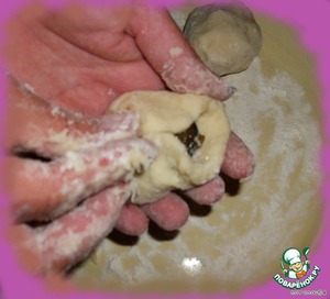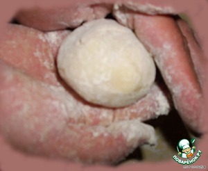 Скатываем, не сжимая ,периодически обсыпая мукой, наш кнедлик в ладошках, формируя аккуратный шарик. Не увлекайтесь, накатайте 10-20 кнедликов и отправляйте их в кипящую воду!!! Иначе сок от фруктов найдет себе дорогу наружу и напрочь испортит ваше кулинарное творение.