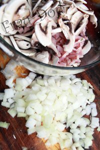 Грибы нарезать пластинами, ветчину - полосками. Лук очистить и измельчить.