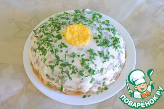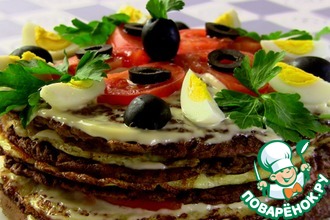 Торт из печeночных блинов, промазанных майонезом с чесноком. Отлично украсит праздничный стол. Одно из моих любимых блюд. Не претендую на оригинальность, но с таким составом, вроде бы, не было.