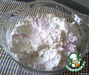 Творог взбить блендером или пропустить через мясорубку (на фото фиолетовые разводы т.к. мой сыночек побросал в него вишню, пришлось спасать.