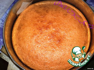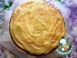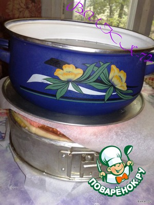 Тортик получился немного неуклюжим :-X, поэтому я соорудила следующую конструкцию: поставила бортик разъемной формы, сверху пергамент и донышко от формы и кастрюлю с водой (груз :-D ), все это упрятала в холодильник на ночь