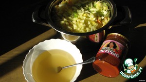 Перемешать и поставить на огонь (или залить и поставить, если мало места в кастрюле, когда кабачки немного осядут, перемешать)