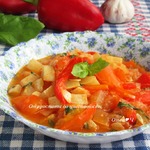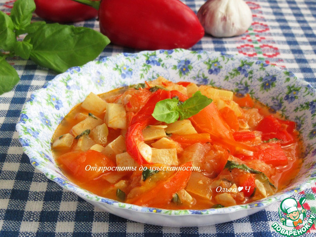 Очень простое в приготовлении и своем составе блюдо, можно закатывать в банки или съедать все сразу (как делаем мы). По вкусу очень напоминает лечо, легкий сладковато-перечный вкус и приятный томатный дух.