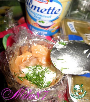 Теперь кладём ложку творожного сыра Альметте, посыпаем зеленью.