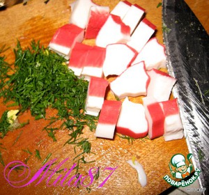 Укладываем по 3-4 кусочка крабовых палочек.