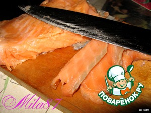Лучше взять готовую нарезку, рыба там порезана очень тонко, поэтому закуска будет изящная и не приторно рыбная (других слов не нашла))).