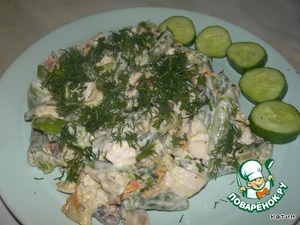 Грудку режем кубиками не очень мелко. Добавляем в салат.