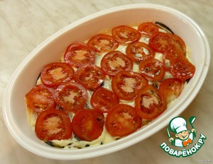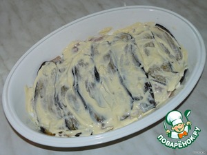 В форму для запекания выложить слой баклажанов немного внахлест друг на друга. -