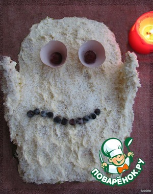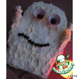 Готовым кремом промазываем оба коржа, складываем один на другой. Из отрезанных уголков одного из коржей делаем нашему приведению ручки (уголки от второго коржа съедаем в качестве бонуса). Поверхность обильно посыпаем кокосовой стружкой (для "пухнастости"). Из смородины делаем улыбочку, а глазки - скорлупа с вишенкой.