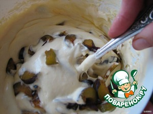 Добавляю мелко порезанную сливу и снова плавно перемешиваю.