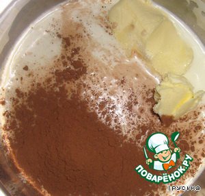 Для глазури. Сахар, молоко, какао, масло варить не доводя до кипения. Охладить. Когда начнет густеть, полить торт.