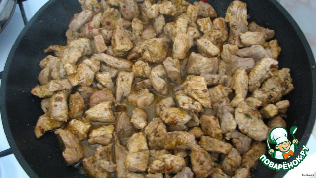 Мясо обжарить в небольшом количестве подсолнечного масла примерно 10 минут (чтобы красного в мясе не было видно), в процессе обжарки посолить и добавить специй. Если любите с корочкой, то не накрывайте сковороду крышкой.