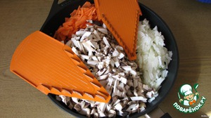 Грибы, лук и морковь помыть, почистить, нарезать (или натереть на мелкой/средней терке), обжарить до полуготовности.