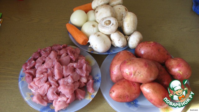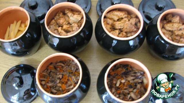 Выкладываем в горшочки сначала картофель, затем смесь грибов-моркови-лука, сверху мясо. Заливаем в горшочки горячую воду, заранее посолить воду по вкусу.