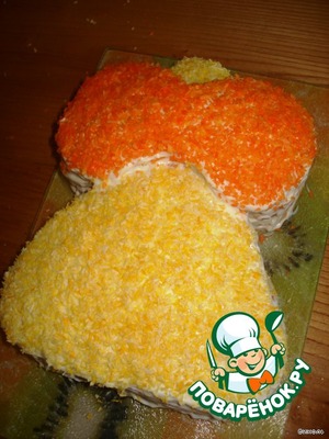 Сборка торта обычная: корж, крем, корж, крем и т. д. Сверху цепляю бантик и тщательно промазываю кремом. Для придания окраса использовала цветную кокосовую стружку. Хотелось бантик сделать красным, но, как всегда, когда что-то надо, оно пропадает со всех магазинов, поэтому использовала оранжевый цвет. Ну вот, тортик и готов. Ждем нашу ученицу со школы и будем праздновать День знаний, потом и в разрезе покажем.