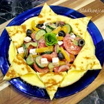 У меня перец, помидор, лук, брынза, заправлен йогуртом.